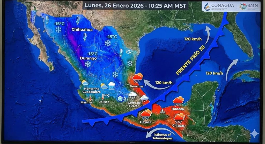 México amanece este lunes 26 de enero de 2026 bajo la influencia de fenómenos meteorológicos que prometen un ambiente gélido en gran parte del territorio nacional. El Frente Frío número 30, en interacción con una potente masa de aire ártico, se desplaza sobre el sur del Golfo de México, el sureste del país y la Península de Yucatán, trayendo consigo un marcado descenso de temperaturas, intensas lluvias y vientos huracanados en varias regiones.