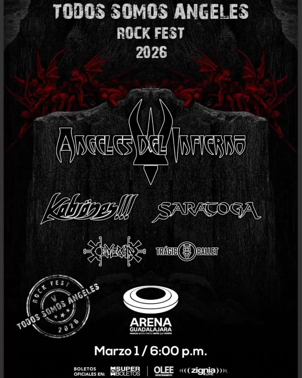 Ángeles del Infierno encabezará el 'Todos Somos Ángeles Rock Fest 2026' en Arena CDMX (15 feb), Arena Monterrey (22 feb) y Arena Guadalajara (1 mar). Descubre el cartel con Saratoga, Transmetal y Kabrönes en esta gira épica por México y Latinoamérica