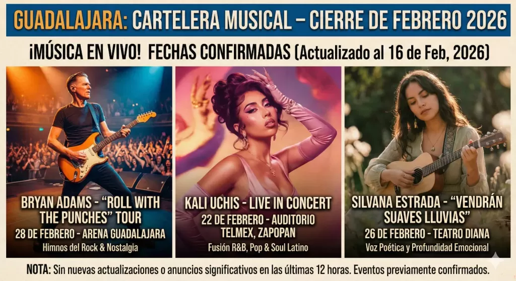 La escena musical de Guadalajara se prepara para un cierre de febrero de 2026 vibrante, con una cartelera que incluye a figuras de talla internacional como Bryan Adams, Kali Uchis y Silvana Estrada. Estos eventos, que prometen noches inolvidables, forman parte de la ya confirmada agenda cultural de la Perla Tapatía. Es importante señalar que, al cierre de la edición del 16 de febrero de 2026, no se han emitido nuevas publicaciones ni actualizaciones significativas en las últimas 12 horas con respecto a estos conciertos específicos.