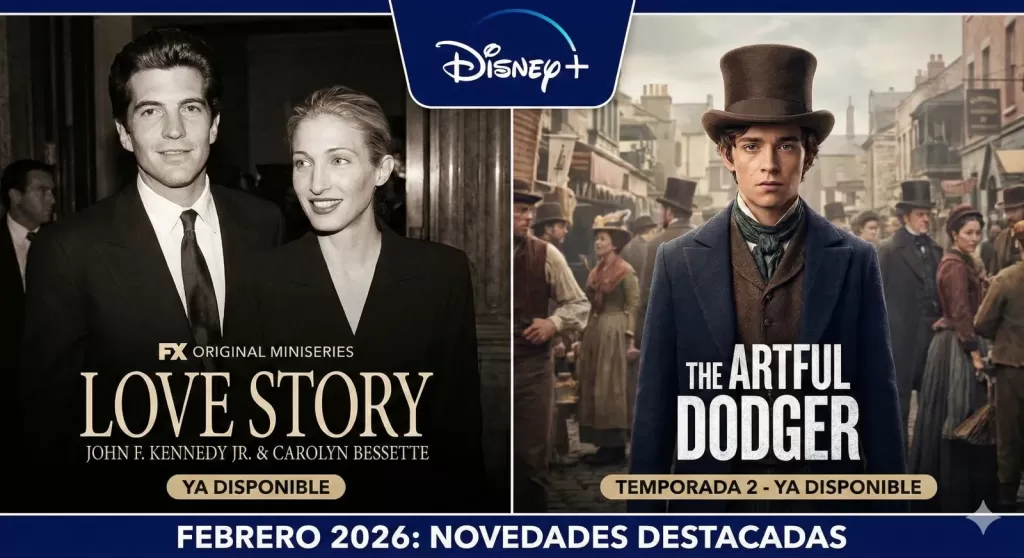Los esperados estrenos de Disney Plus en febrero de 2026: la miniserie 'Love Story: John F. Kennedy Jr. & Carolyn Bessette' (16 de febrero) y la segunda temporada de 'The Artful Dodger' (10 de febrero). Sumérgete en dramas históricos y aventuras.
