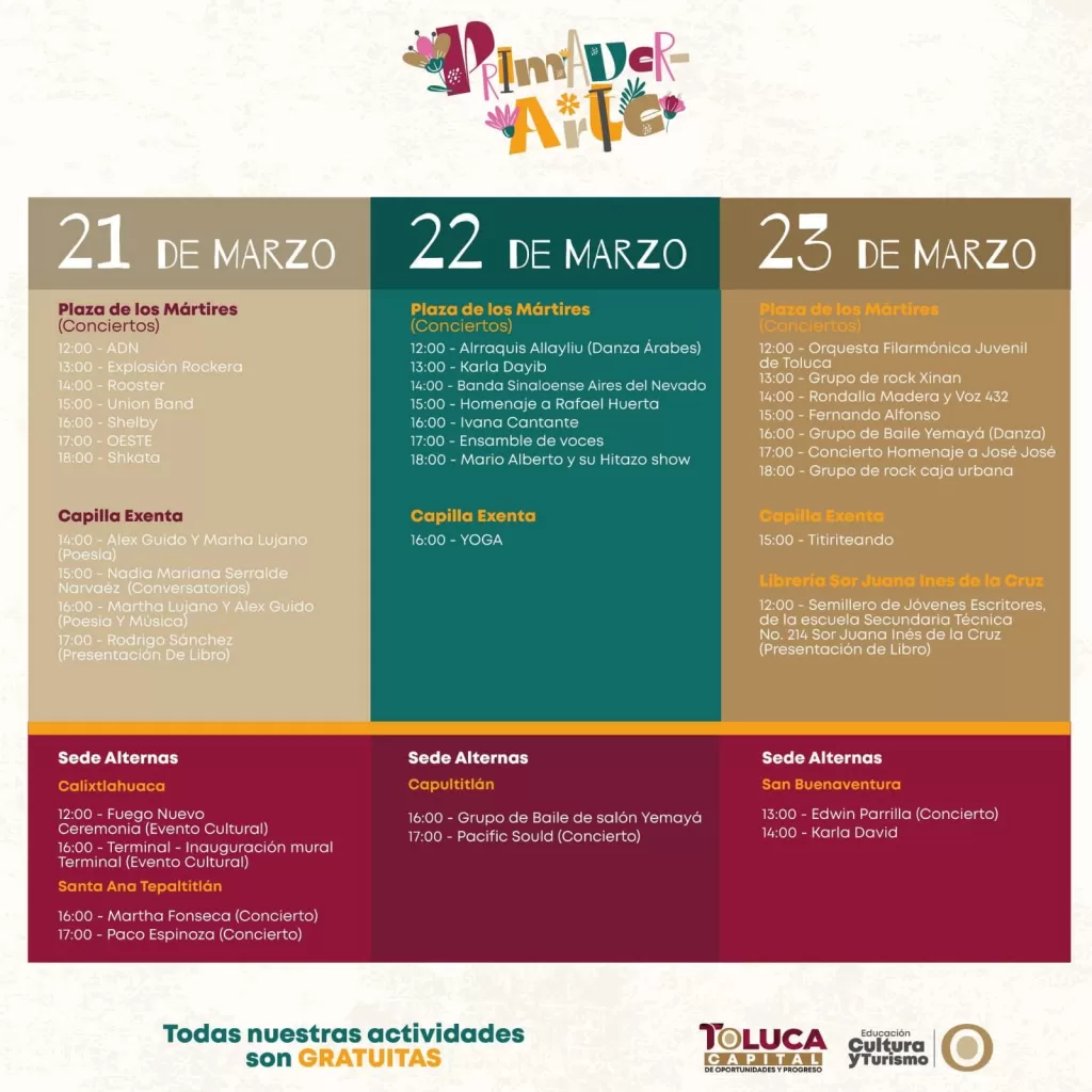 Toluca vibrará con PrimaverArte del 17 al 22 de marzo: música con Uzielito Mix, teatro, danza y la 1ª Feria de Lectura. Descubre un festival cultural que promete sorpresas y arte para toda la familia en México.
