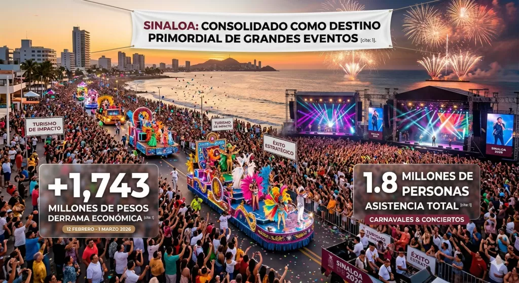 Sinaloa ha consolidado su posición como un destino primordial para la realización de grandes eventos, tras registrar una impresionante derrama económica de más de mil 743 millones de pesos entre el 12 de febrero y el 1 de marzo de 2026. Este periodo, marcado por la celebración de diversos carnavales y conciertos de gran magnitud, atrajo a una asistencia total de 1.8 millones de personas, evidenciando el creciente atractivo de la entidad para el turismo de eventos y espectáculos.